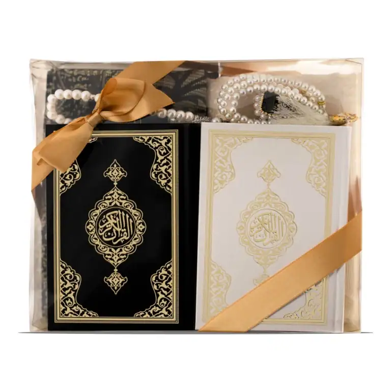 İkili Kuran + Seccade + Tesbih + Zikirmatik + Esans Hediye Seti (Krem-Siyah, Çanta Boy, 99lu+33lü)