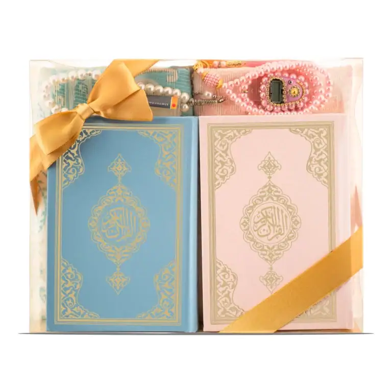 İkili Kuran + Seccade + Tesbih + Zikirmatik + Esans Hediye Seti (Pembe-Mavi, Çanta Boy, 99lu+33lü)