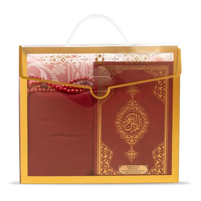 Çantalı Kuran Hediye Seti + Seccade + Eşarp + Tesbih (Çanta Boy, Bordo)