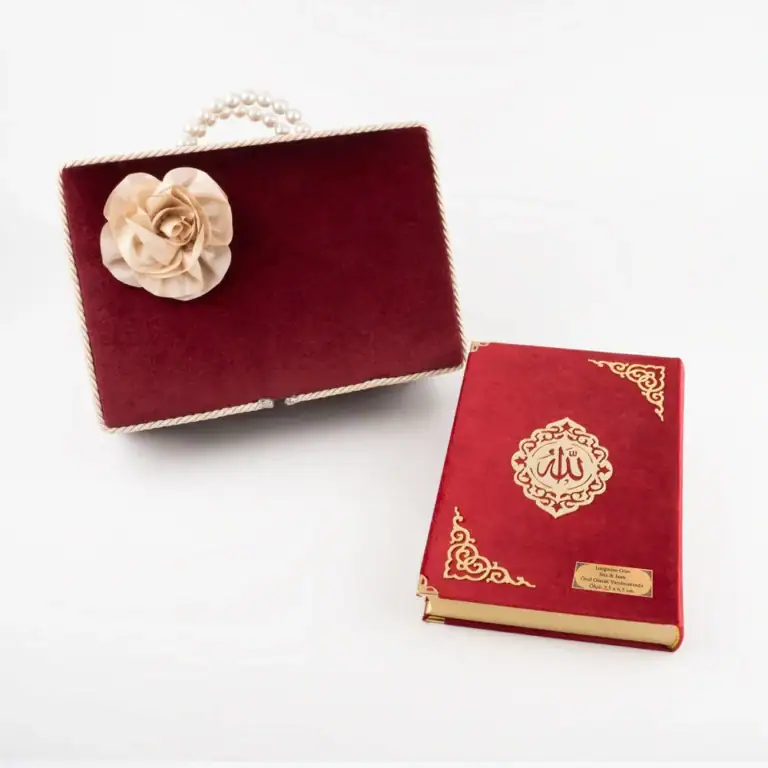 Kadife Kutulu Kuran Hediye Seti (Orta Boy, Ay Yıldızlı, Gümüş Pleksi, Kırmızı)