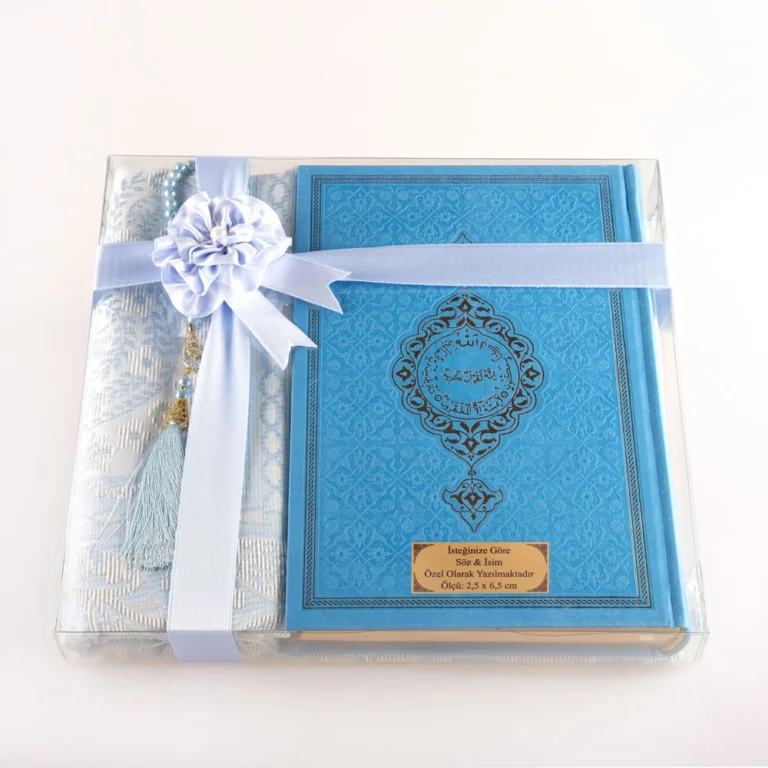 Kadınlara Özel Hediyelik Kuran-ı Kerim Seti, Seccade + Tesbih (Termo Deri, Orta Boy, Mavi)