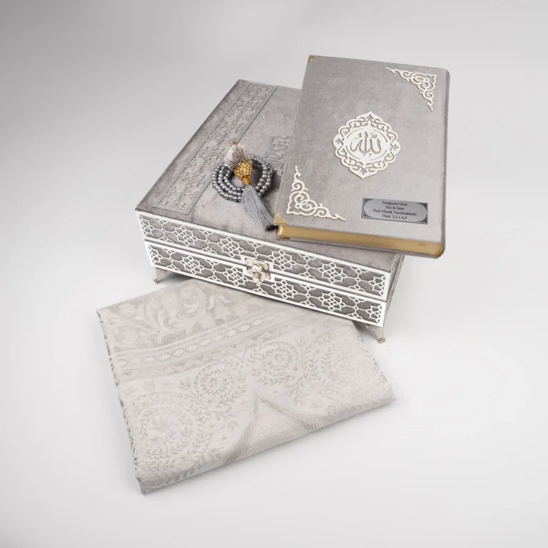 Erkeklere Özel Çeyiz & Bohça Hediye Seti – 4 Parça (Kuran, Seccade, Tesbih, Orta Boy, Gri)