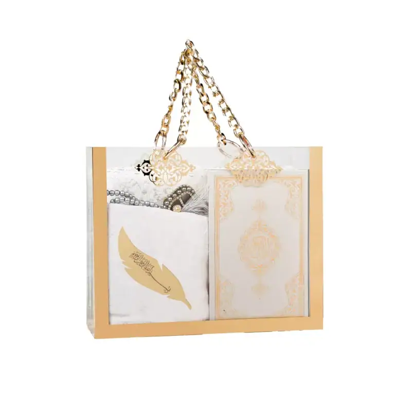 Kuran + Seccade + Eşarp + Tesbih + Zikirmatik + Ayraç Hediye Seti (Çanta Boy, Gold)