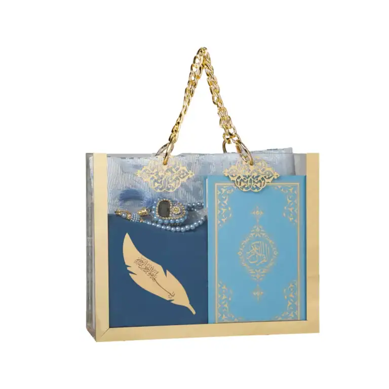 Kuran + Seccade + Eşarp + Tesbih + Zikirmatik + Ayraç Hediye Seti (Çanta Boy, Mavi)