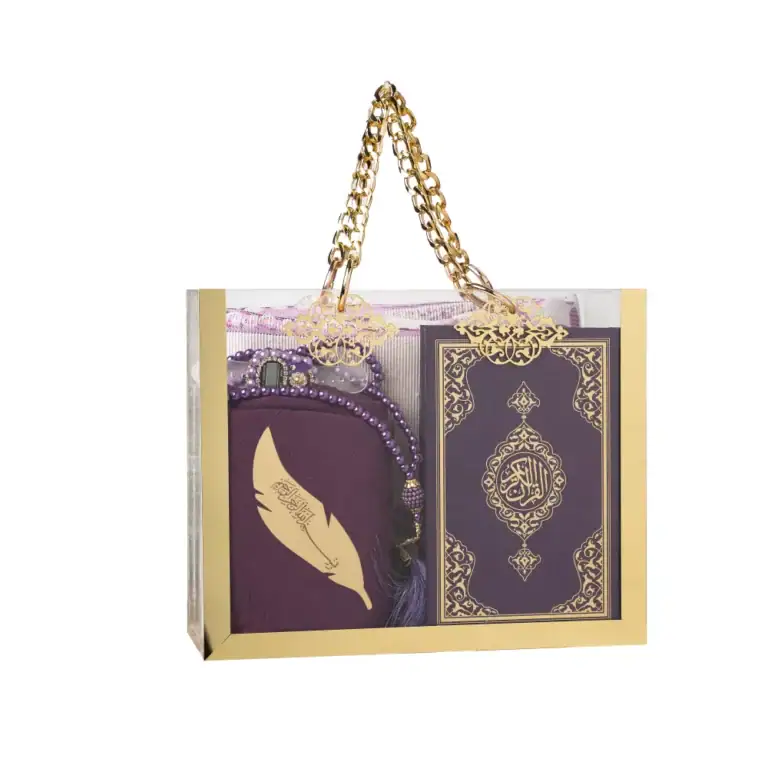 Kuran + Seccade + Eşarp + Tesbih + Zikirmatik + Ayraç Hediye Seti (Çanta Boy, Mor)