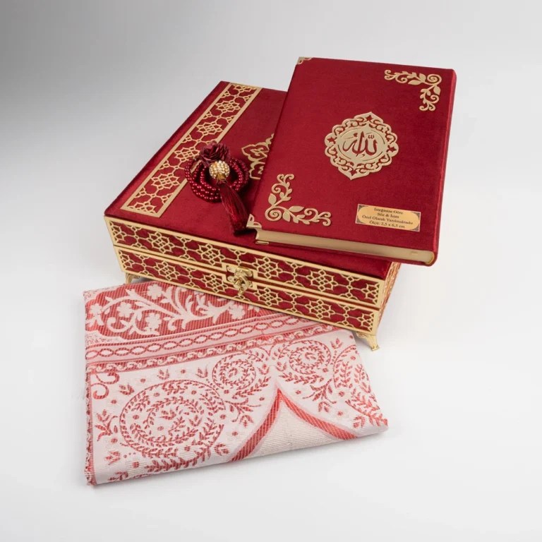 Erkeklere Özel Çeyiz & Bohça Hediye Seti – 4 Parça (Kuran, Seccade, Tesbih, Orta Boy, Bordo)