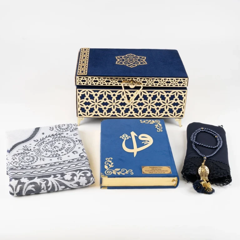 Desenli Çeyizlik Kutu, Şal + Seccade + Tesbih + Kuran Hediye Seti (Hafız Boy, Lacivert)