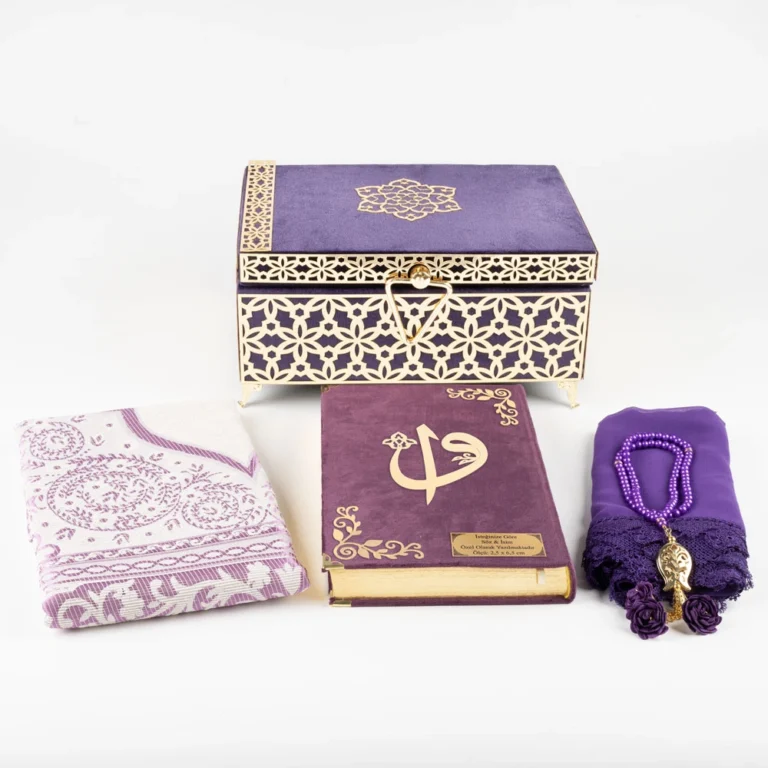 Desenli Çeyizlik Kutu, Şal + Seccade + Tesbih + Kuran Hediye Seti (Hafız Boy, Mor)