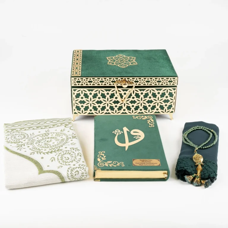 Desenli Çeyizlik Kutu, Şal + Seccade + Tesbih + Kuran Hediye Seti (Hafız Boy, Yeşil)
