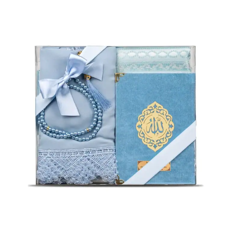 Yasin + Seccade + Tesbih + Şal Hediye Seti (Çanta Boy, Şems Lafzatullah, Mavi)