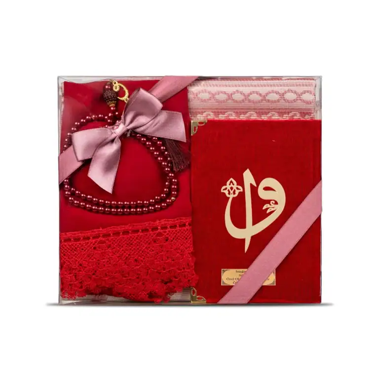 Yasin + Seccade + Tesbih + Şal Hediye Seti (Çanta Boy, Elif Vav, Kırmızı)