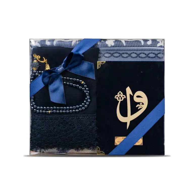 Yasin + Seccade + Tesbih + Şal Hediye Seti (Çanta Boy, Elif Vav, Lacivert)