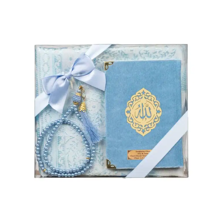 Seccade + Tesbih + Yasin Hediye Seti (Çanta Boy, Şantuk Kese, Mavi)