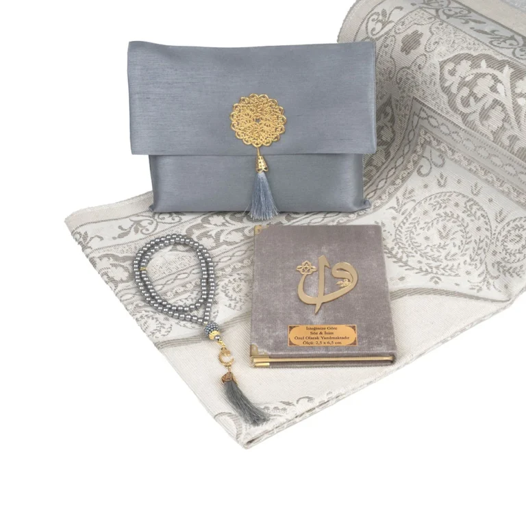 Yasin + Seccade + Tesbih Hediye Seti (Çanta Boy, Elif Vav, Gri)