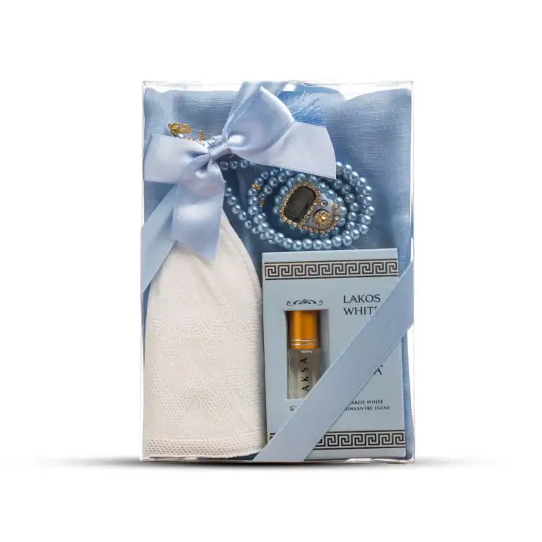Eşarp + Takke + Esans + Tesbih + Zikirmatik Hediye Seti (Asetat Kutulu, Mavi)