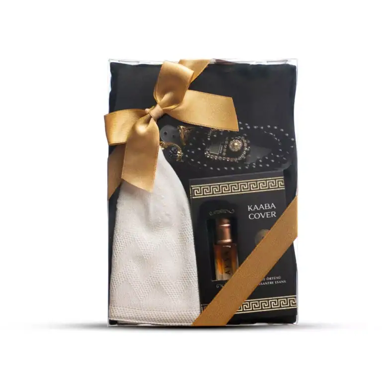 Eşarp + Takke + Esans + Tesbih + Zikirmatik Hediye Seti (Asetat Kutulu, Siyah)