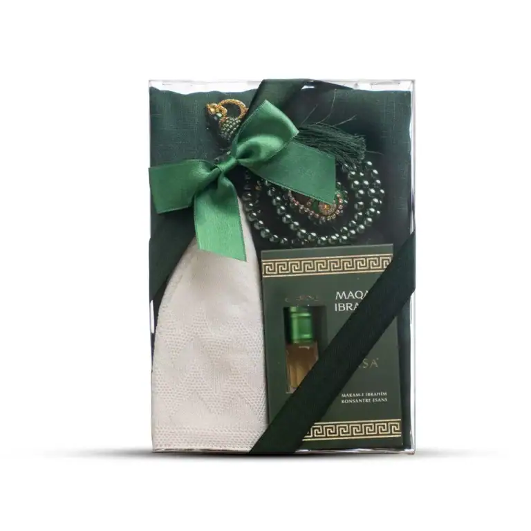 Eşarp + Takke + Esans + Tesbih + Zikirmatik Hediye Seti (Asetat Kutulu, Yeşil)