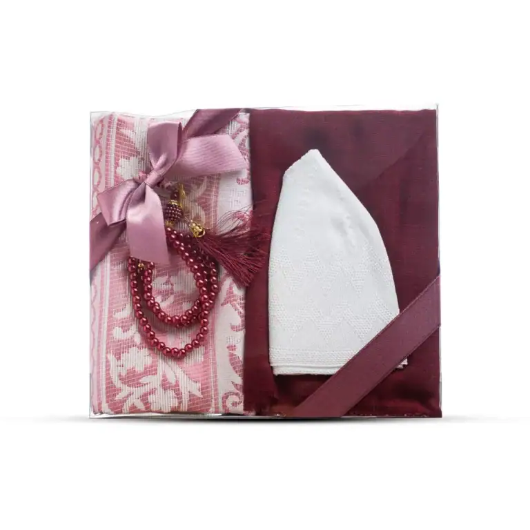 Seccade + Eşarp + Takke + Tesbih Hediye Seti (Asetat Kutulu, Bordo)