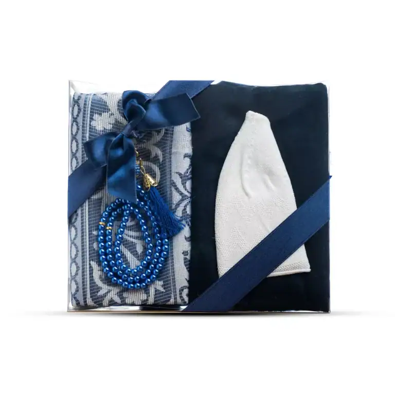 Seccade + Eşarp + Takke + Tesbih Hediye Seti (Asetat Kutulu, Lacivert)