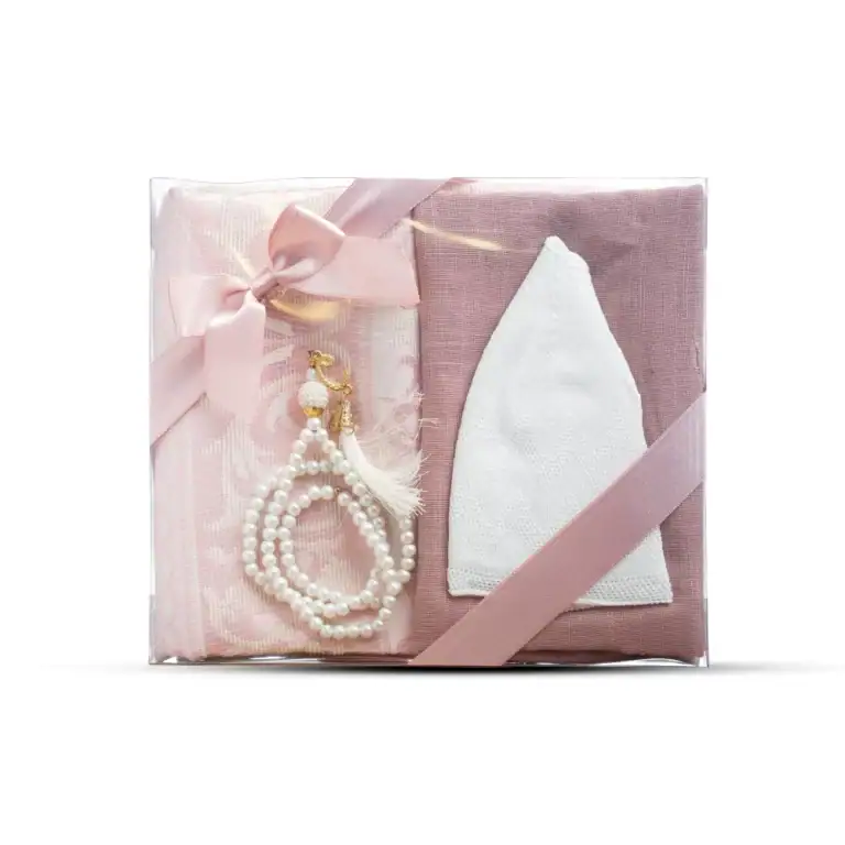 Seccade + Eşarp + Takke + Tesbih Hediye Seti (Asetat Kutulu, Pembe)