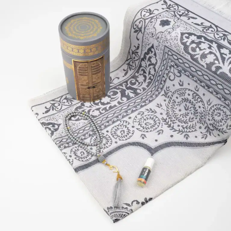Seccade + Tesbih + Esans Hediye Seti (Kabe Desen, Gri)