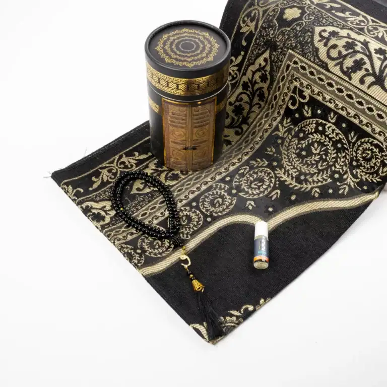 Seccade + Tesbih + Esans Hediye Seti (Kabe Desen, Siyah)