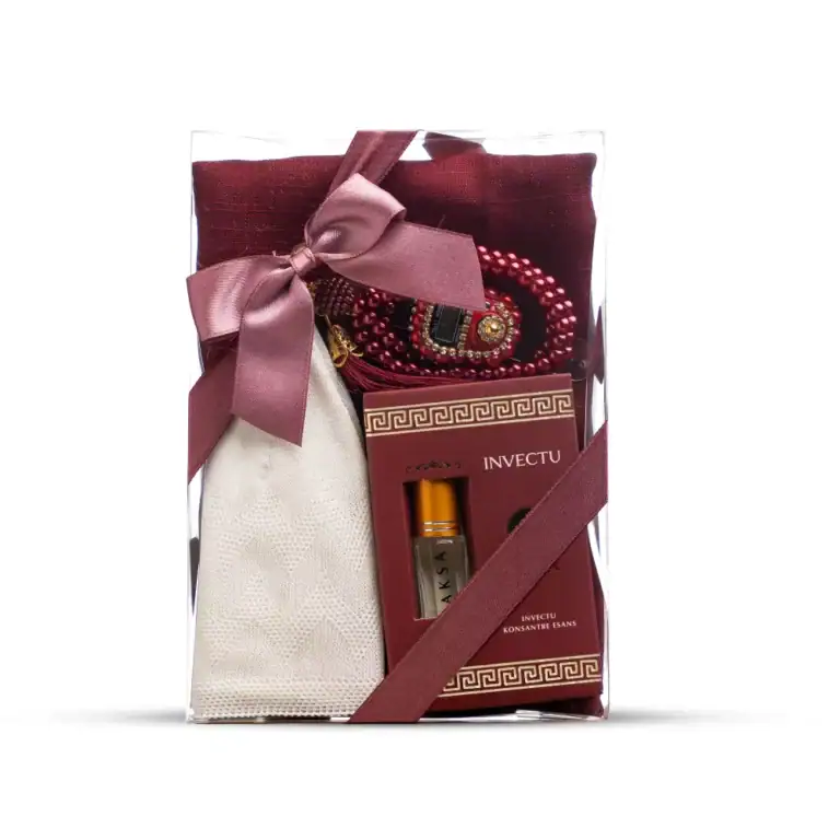 Eşarp + Takke + Esans + Tesbih + Zikirmatik Hediye Seti (Asetat Kutulu, Bordo)