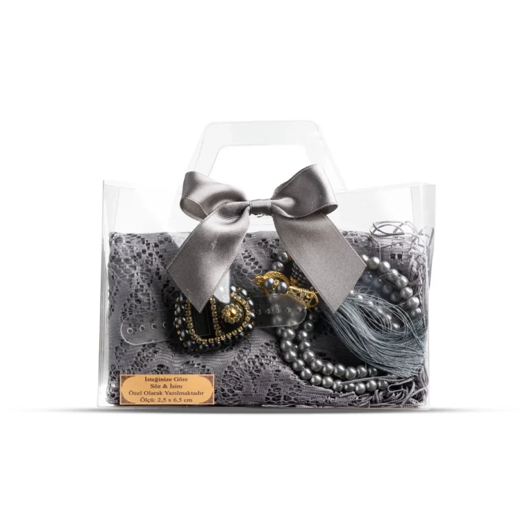 Tesbih + Dantelli Şal + Zikirmatik Hediye Seti (Çantalı Asetat Kutulu, Gri)