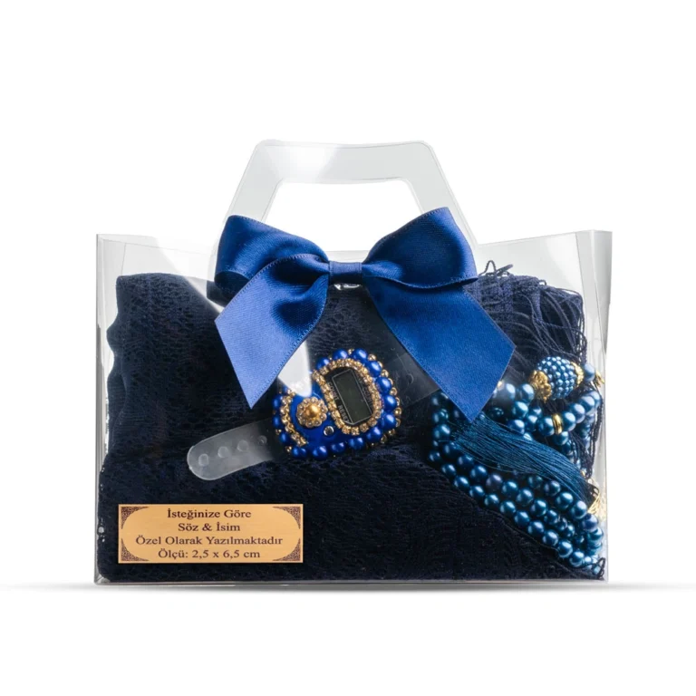 Tesbih + Dantelli Şal + Zikirmatik Hediye Seti (Çantalı Asetat Kutulu, Lacivert)