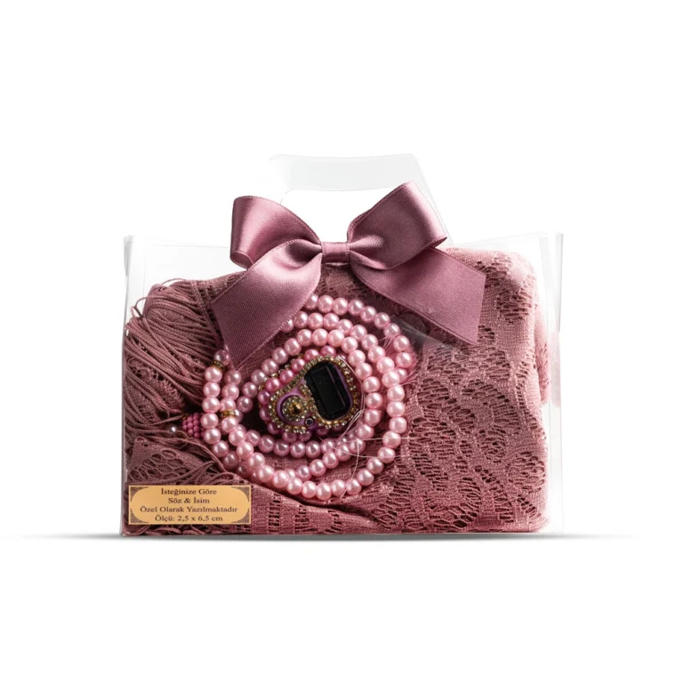 Tesbih + Dantelli Şal + Zikirmatik Hediye Seti (Çantalı Asetat Kutulu, Pembe)