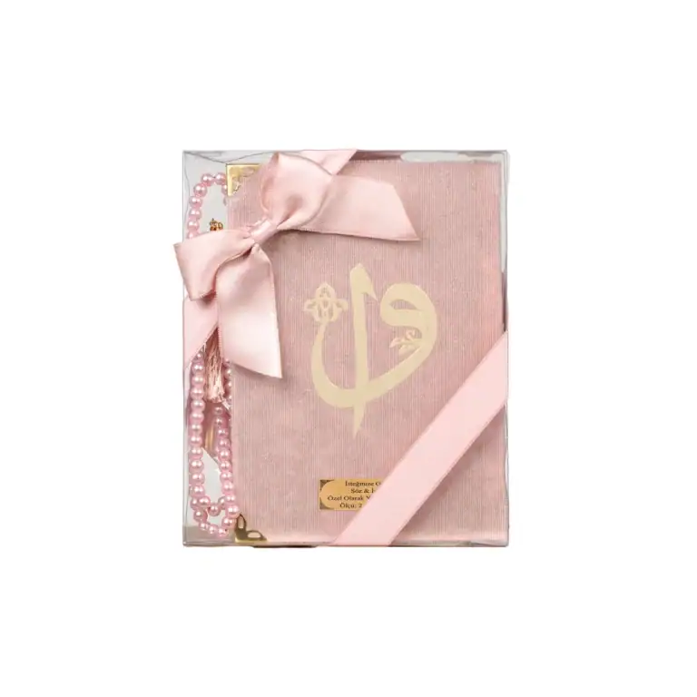 Hediyelik Kuran-ı Kerim Seti, Seccade + Tesbih (Kadife, Elif Vav, Hafız Boy, Pembe)