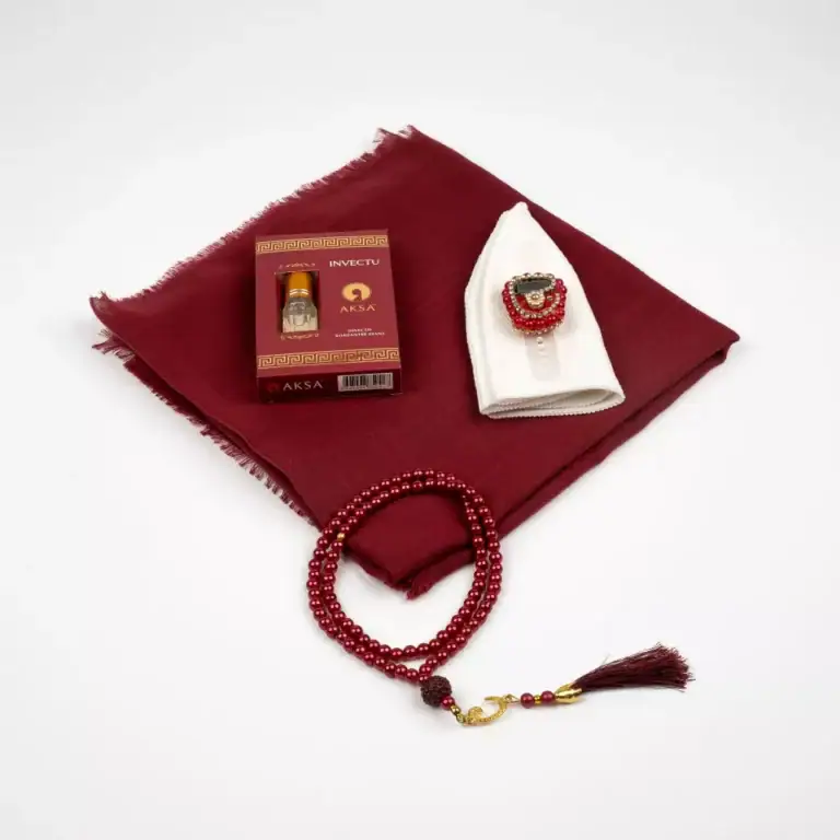 Eşarp + Takke + Esans + Tesbih + Zikirmatik Hediye Seti (Asetat Kutulu, Bordo)