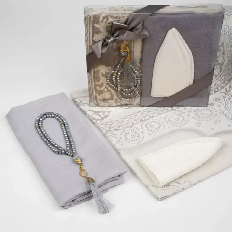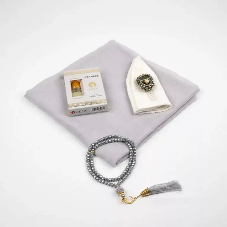 Seccade + Eşarp + Takke + Tesbih Hediye Seti (Asetat Kutulu, Gri)