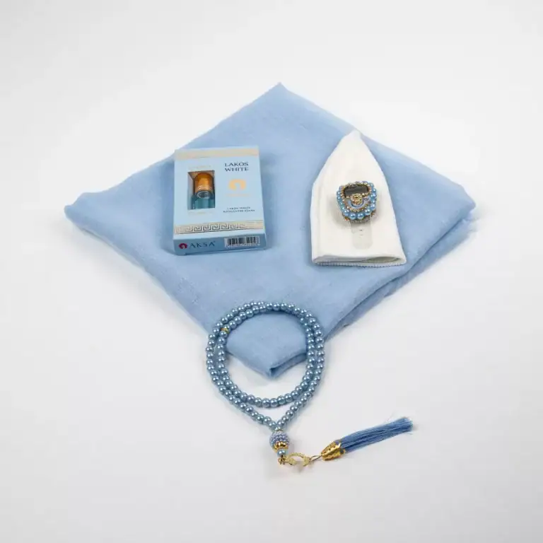 Eşarp + Takke + Esans + Tesbih + Zikirmatik Hediye Seti (Asetat Kutulu, Mavi)