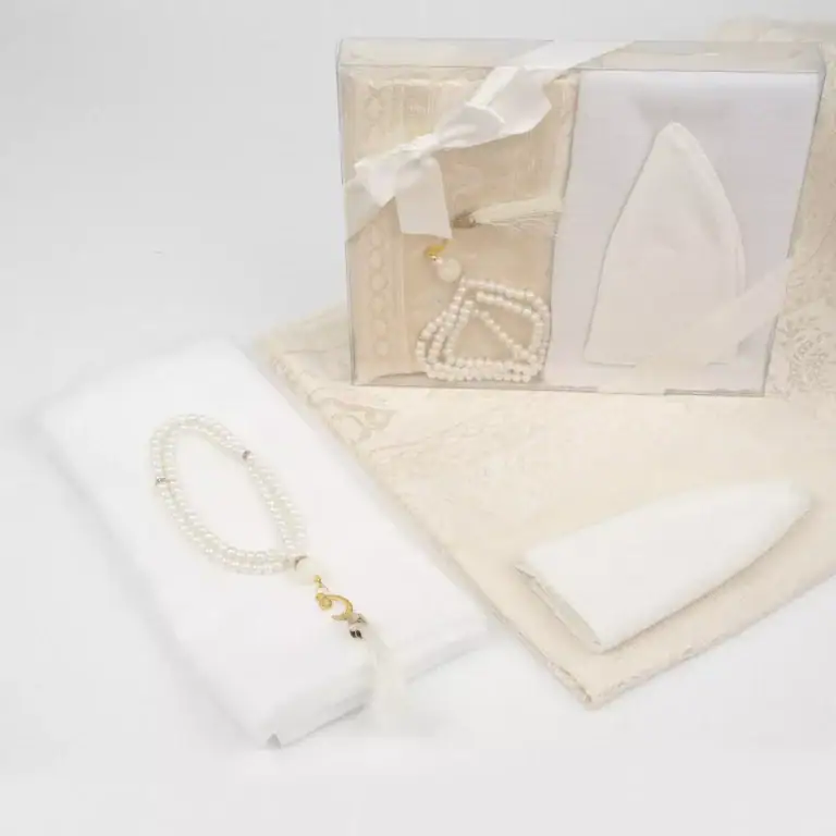 Seccade + Eşarp + Takke + Tesbih Hediye Seti (Asetat Kutulu, Beyaz)
