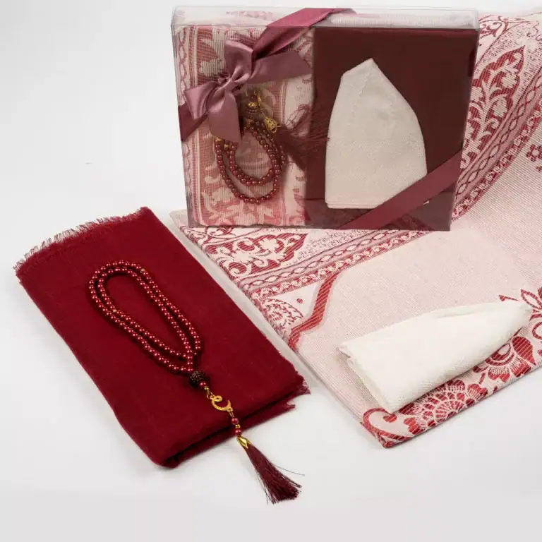Seccade + Eşarp + Takke + Tesbih Hediye Seti (Asetat Kutulu, Bordo)