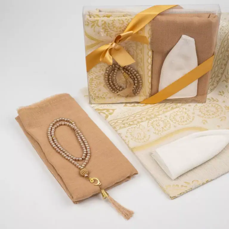 Seccade + Eşarp + Takke + Tesbih Hediye Seti (Asetat Kutulu, Gold)