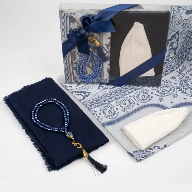 Seccade + Eşarp + Takke + Tesbih Hediye Seti (Asetat Kutulu, Lacivert)