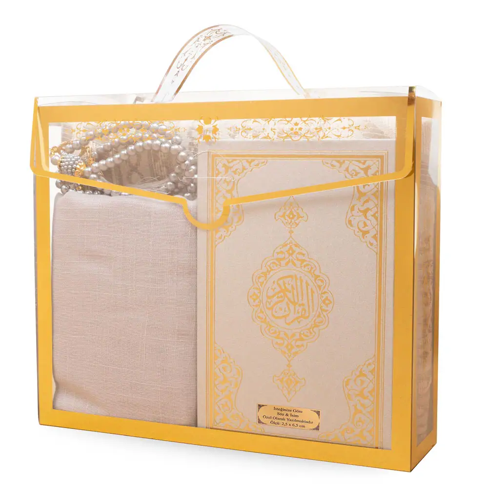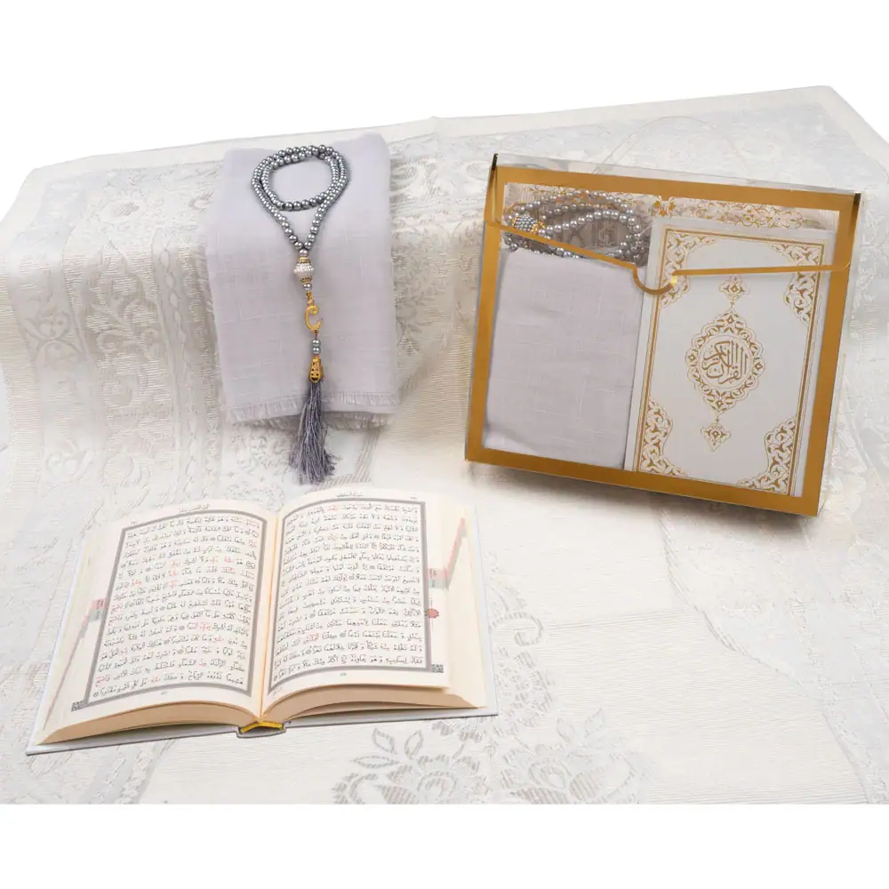 Çantalı Kuran Hediye Seti + Seccade + Eşarp + Tesbih (Çanta Boy, Gri)