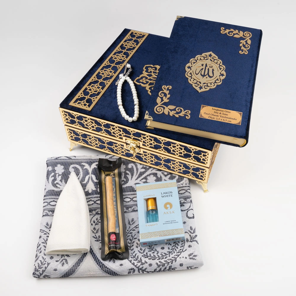 Erkek Çocuklara Özel Kuran Hediye Seti + Seccade + Tesbih + Takke + Misvak + Koku (Kare Raşel Kutu Orta Boy, Lacivert)