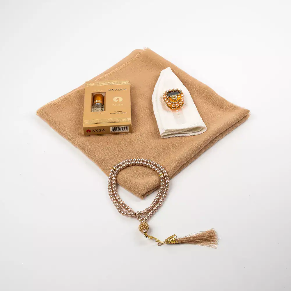 Eşarp + Takke + Esans + Tesbih + Zikirmatik Hediye Seti (Asetat Kutulu, Gold)