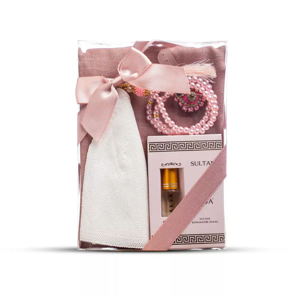 Eşarp + Takke + Esans + Tesbih + Zikirmatik Hediye Seti (Asetat Kutulu, Pembe)