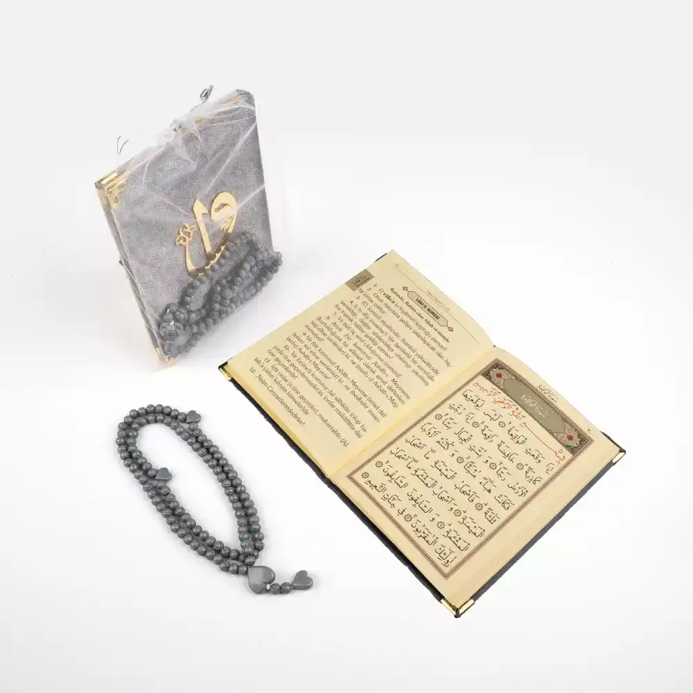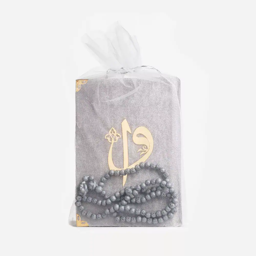 Gül Kokulu Tesbih + Yasin Hediye Seti (Çanta Boy, Tül Keseli, Gri)