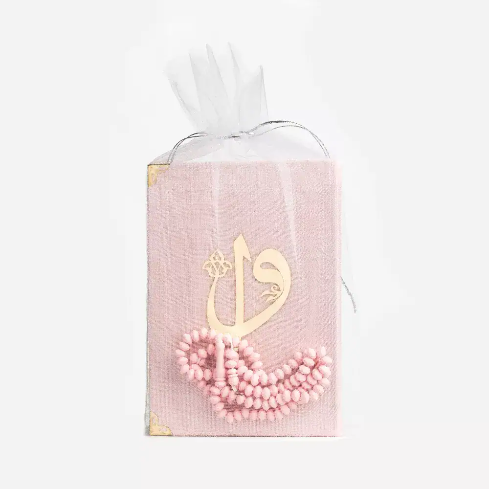 Gül Kokulu Tesbih + Yasin Hediye Seti (Çanta Boy, Tül Keseli, Pembe)