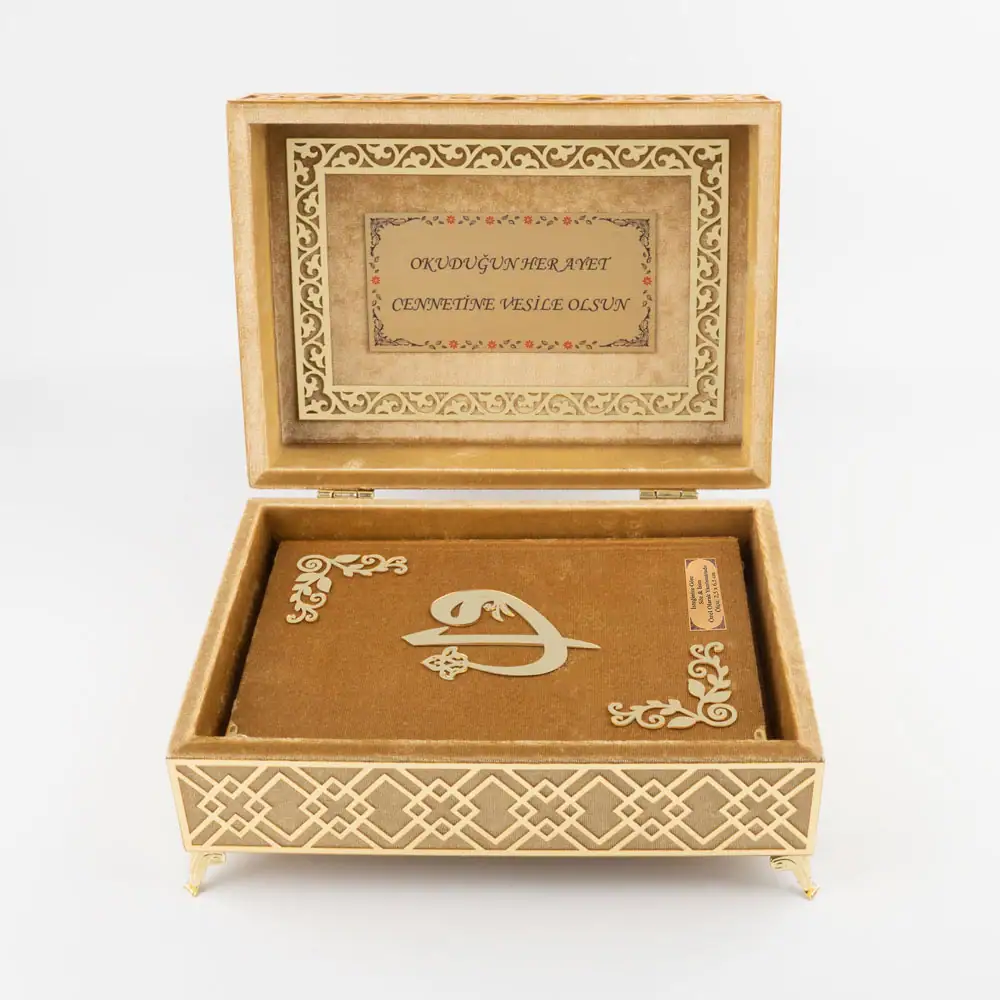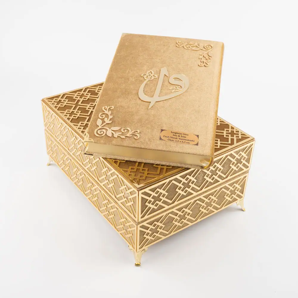 Hediyelik Kadife Kutu Kur’an-ı Kerim Yatay Model (Orta Boy, Elif Vav, Gold)