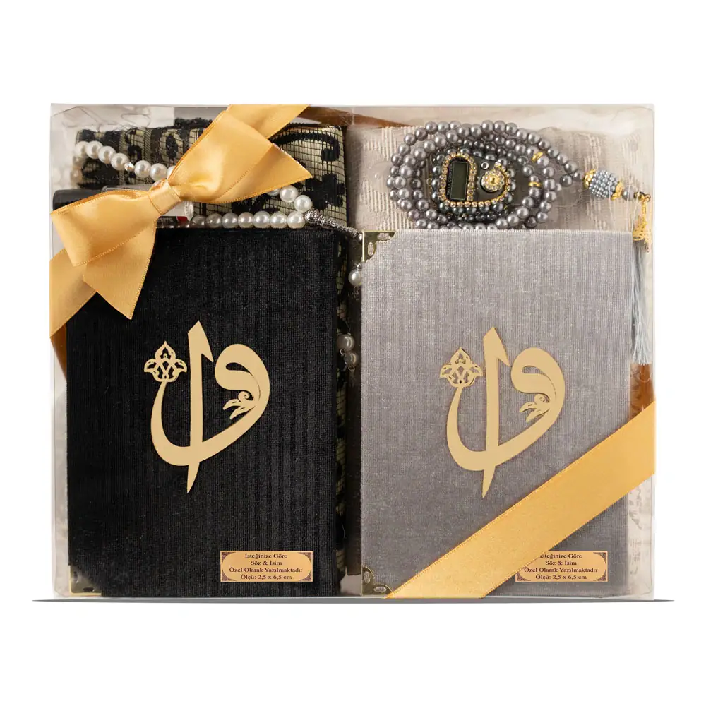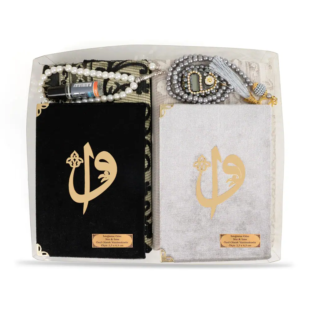 İkili Yasin + Seccade + Tesbih + Zikirmatik + Esans Hediye Seti (Siyah-Gri, Çanta Boy, 99lu+33lü)