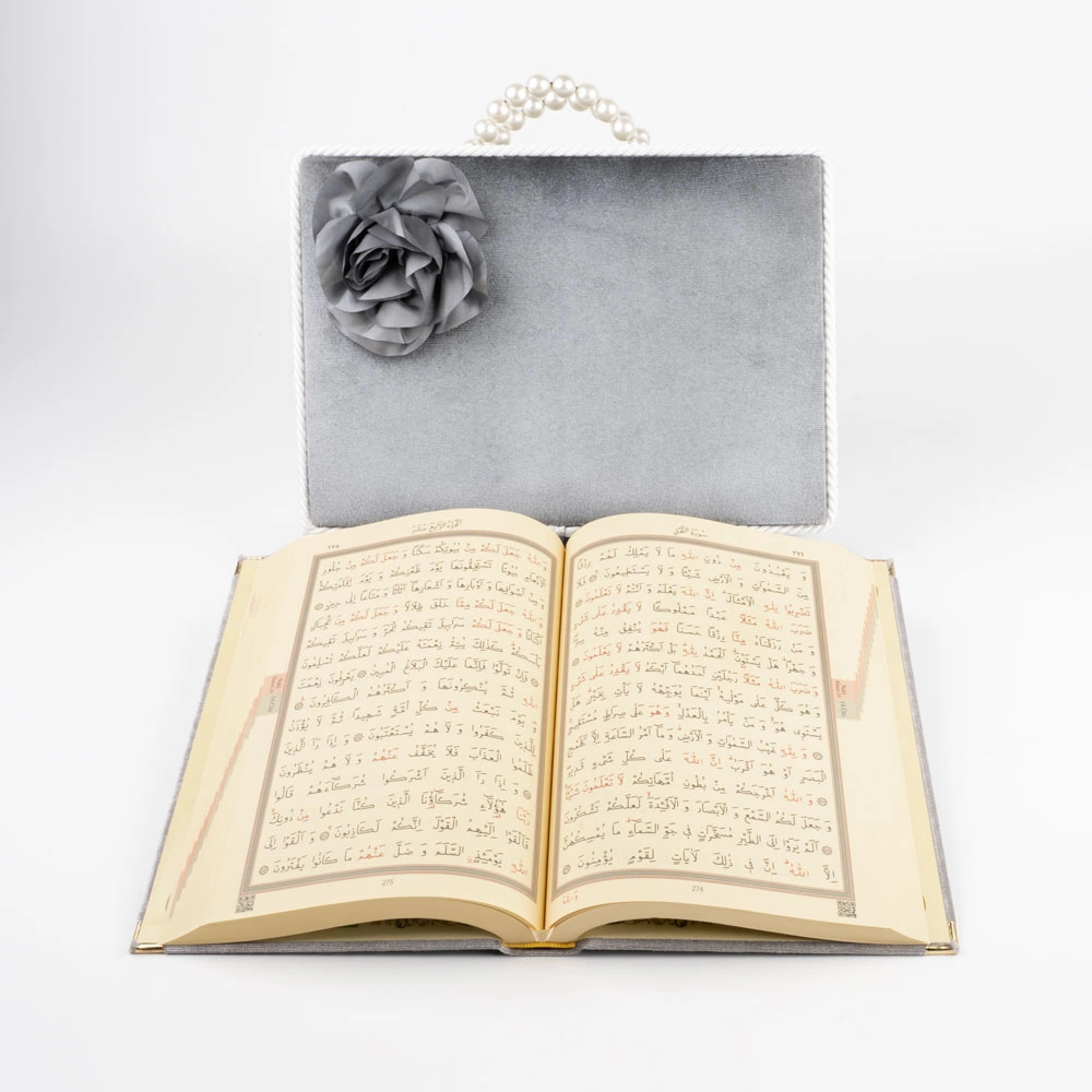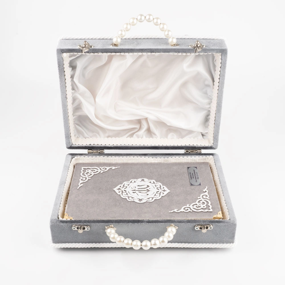 İnci Çantalı Çeyizlik Kuranı Kerim (Orta Boy, Gri)