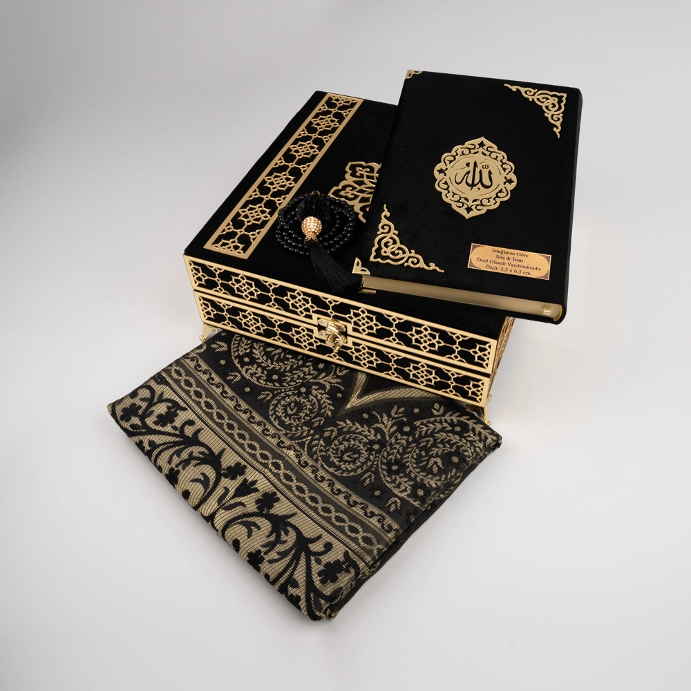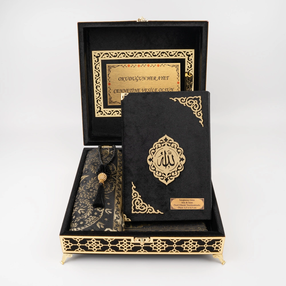 Kare Raşel Kutu Kuran + Seccade + Tesbih (Orta Boy, Siyah)