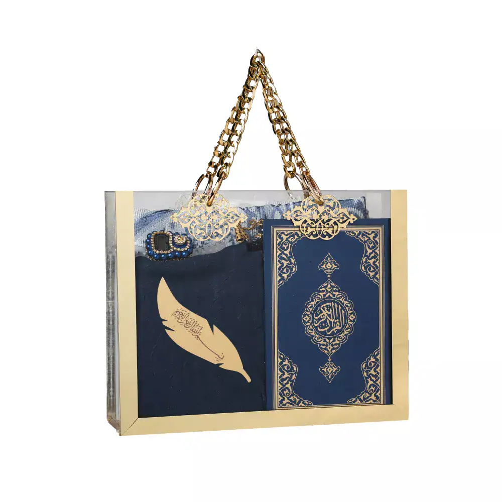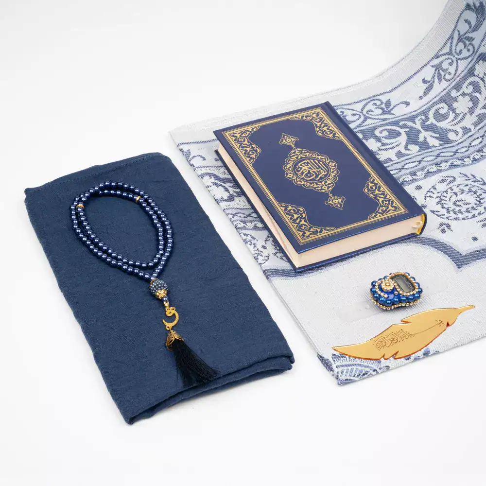 Kuran + Seccade + Eşarp + Tesbih + Zikirmatik + Ayraç Hediye Seti (Çanta Boy, Lacivert)