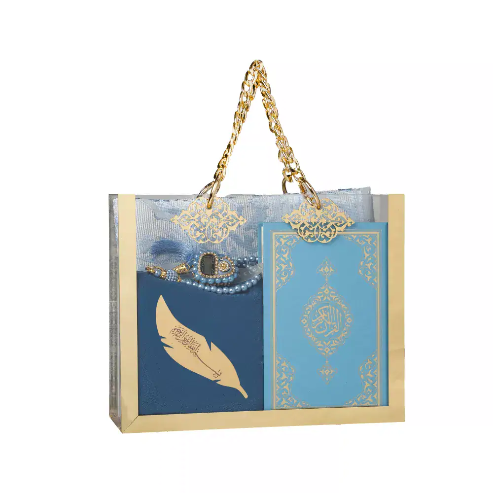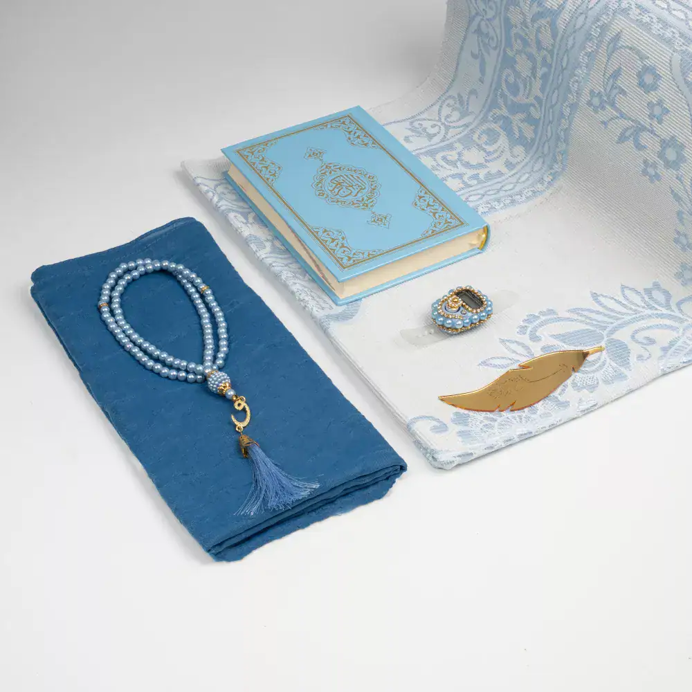 Kuran + Seccade + Eşarp + Tesbih + Zikirmatik + Ayraç Hediye Seti (Çanta Boy, Mavi)